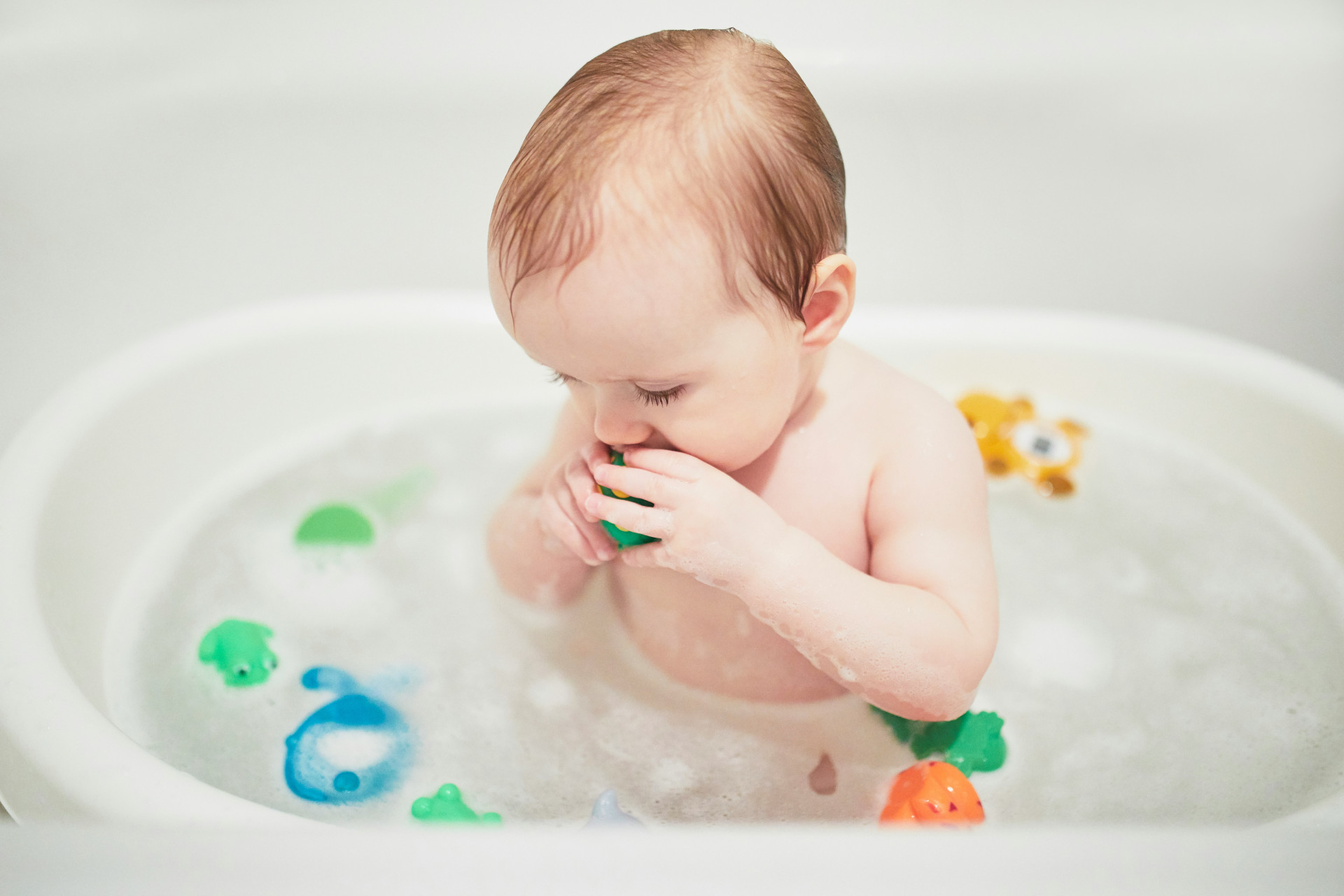 Nej, babyer bør kun bruge badelegetøj, der er beregnet til deres alder. Det skal være uden små dele og lavet af bløde, sikre materialer. Tjek altid producentens aldersanbefaling.